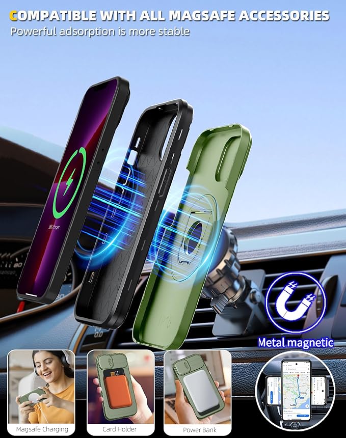 - [Compatible with MagSafe & Super Magnetic] for iPhone 13 Pro Max Case magnetic made of 38 upgraded powerful N52 magnets, the built-in magnetic ring can strengthen the Magnet connection to be compatible with MagSafe accessories such as wireless charger, magnetic car mount, magnetic battery bank, magnetic wallet etc. Perfectly aligned magnetic ring make wireless charging faster and easier without removing the case.The versatile kickstand on the back of the phone case folds back into a groove when unused.