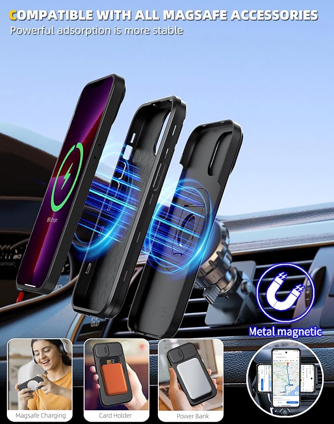 for iPhone 12 Pro Max Case Compatible with MagSafe Magnetic,with 2 Screen Protector,with Camera Cover&360°Kickstand Ring,Military Grade Drop Shockproof Heavy Duty Protection Phone Bumper Black