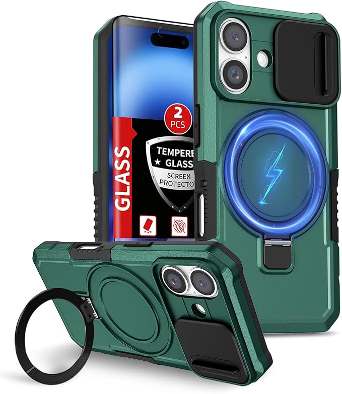 for iPhone 16 Case Magnetic Compatible with MagSafe Wireless Charging,with 2 Screen Protectors,for 16 Case Built-in Kickstand+Camera Cover Anti-Scratch Shockproof Heavy Duty Protection Green