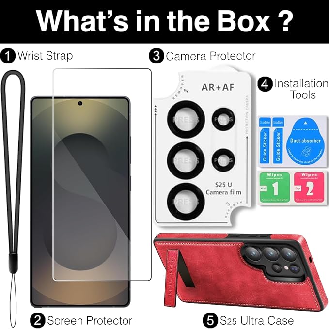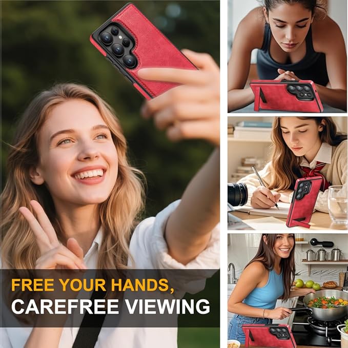 for Galaxy S25 Ultra Leather Case, Built-in Foldable Alloy Stand, with Camera Lens and Screen Protector, Slim Shockproof Kickstand Phone Cover 2025 (Red)