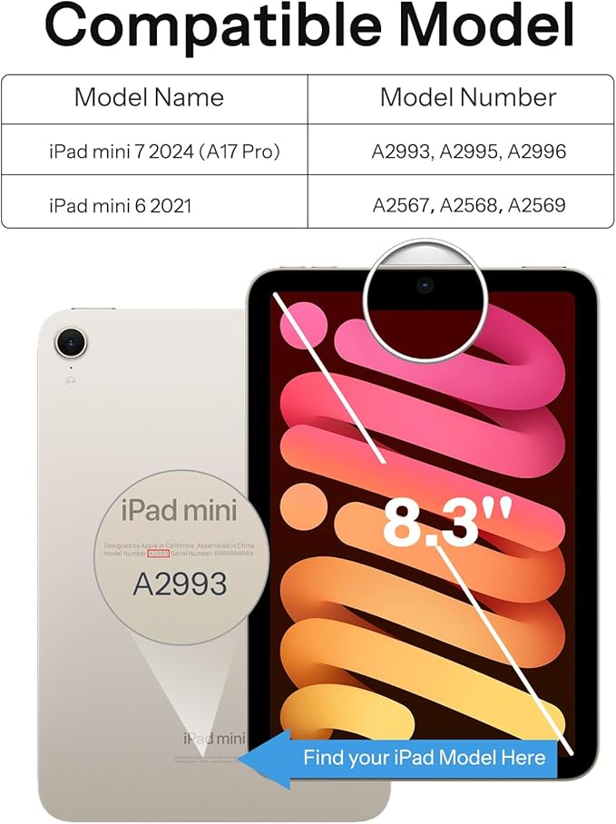 - Compatibility: Only compatible with 8.3-inch iPad Mini 7 2024(A17 Pro)/iPad Mini 6 2021. Models:A2993/A2995/A2996/A2567/A2568/A2569, please check the model number on the back of your iPad before purchasing