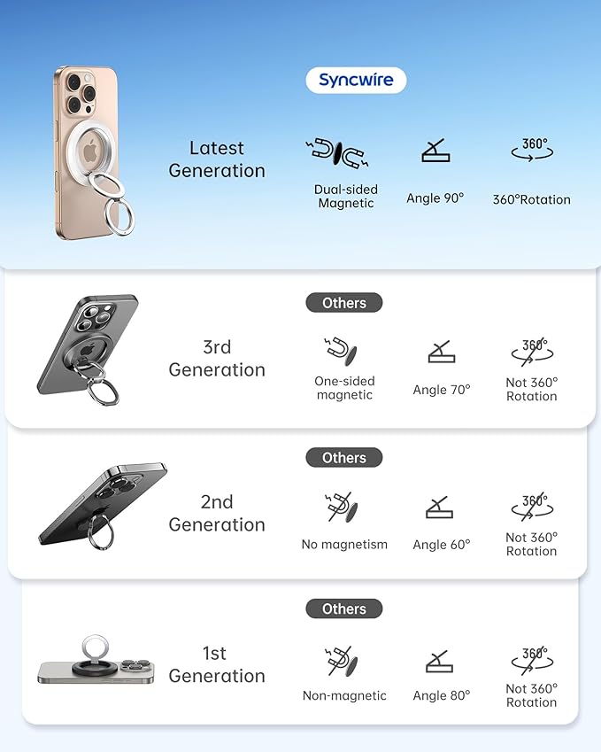 - 【Super Strong Magnetic & MagSafe Compatibility】 The Syncwire MagSafe Phone Grip is made with N52 NdFeB magnets, ensuring seamless attachment to MagSafe-enabled phones and cases with reinforced magnets. It also provides universal compatibility when used with the included magnetic ring for non-MagSafe devices. The magnetic strength increases by 5 times when used with the provided metal ring.