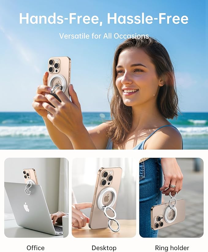 - 【Experience Ultimate Versatility with the Syncwire MagSafe Phone Grip】 The perfect hands-free solution for crowded commutes on subways or buses. Whether placed on your desk, kitchen counter, or used during video calls, movie watching, music listening, or makeup application, the Syncwire Phone Ring Stand elevates your daily activities with convenience and style.【What You Get】Syncwire Magnetic Phone Ring Holder for MagSafe, 2 Round Metal Rings (White & Black), Positioner, User Manual.