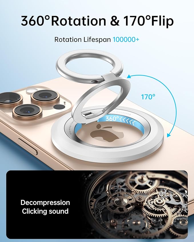 - 【360° Rotatable & 170° Foldable Design】 The dual-ring design allows for multi-angle adjustments to meet different usage needs. The stable hinge lock system is perfect for office video calls, selfies, and media streaming. This magnetic phone ring holder has been tested to withstand over 6000 folds without loosening, significantly improving its durability.