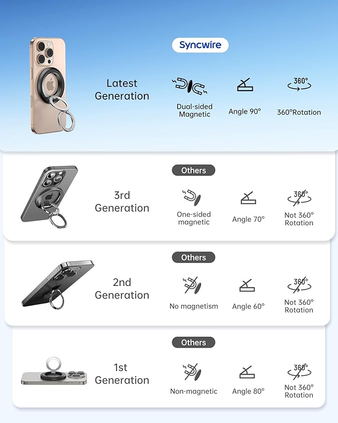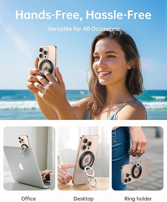 - 【Experience Ultimate Versatility】The Syncwire ring stand features a wide angle and extended support arm, allowing you to place your phone upright on a desk—ideal for work, video calls, Kindle reading, watching videos, selfies, and more. Syncwire MagSafe phone grip brings convenience and style to your daily activities, offering easy one-handed operation and secure grip to reduce the risk of accidental drops.