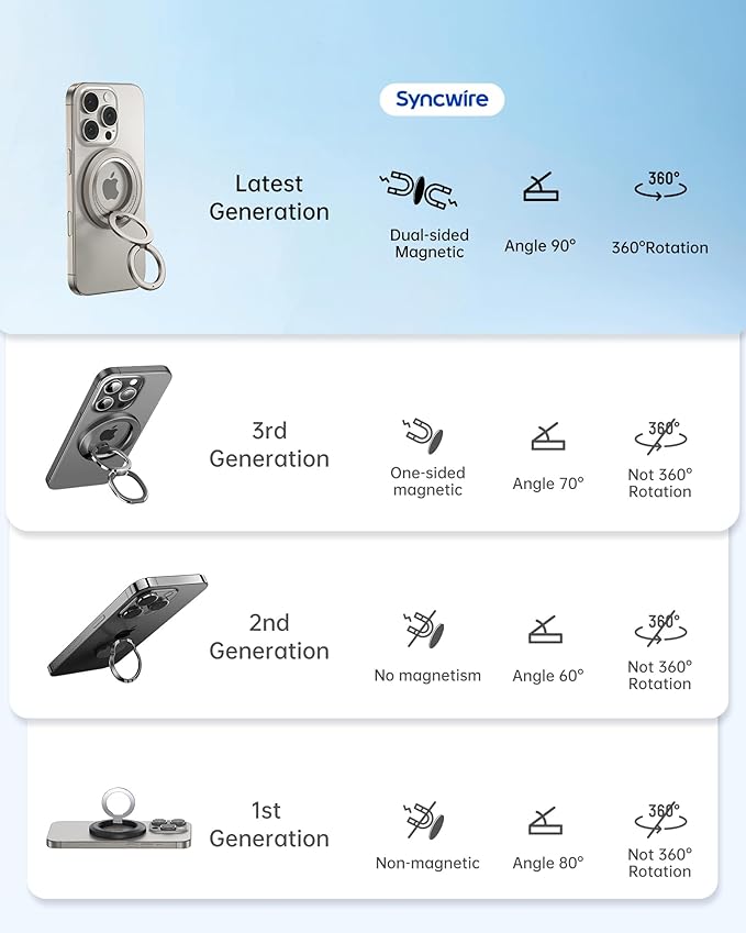 - 【Super Strong Magnetic & MagSafe Compatibility】 The Syncwire MagSafe Phone Ring Stand is made with N52 NdFeB magnets, ensuring seamless attachment to MagSafe-enabled phones and cases with reinforced magnets. It also provides universal compatibility when used with the included magnetic ring for non-MagSafe devices. The magnetic strength increases by 5 times when used with the provided metal ring.