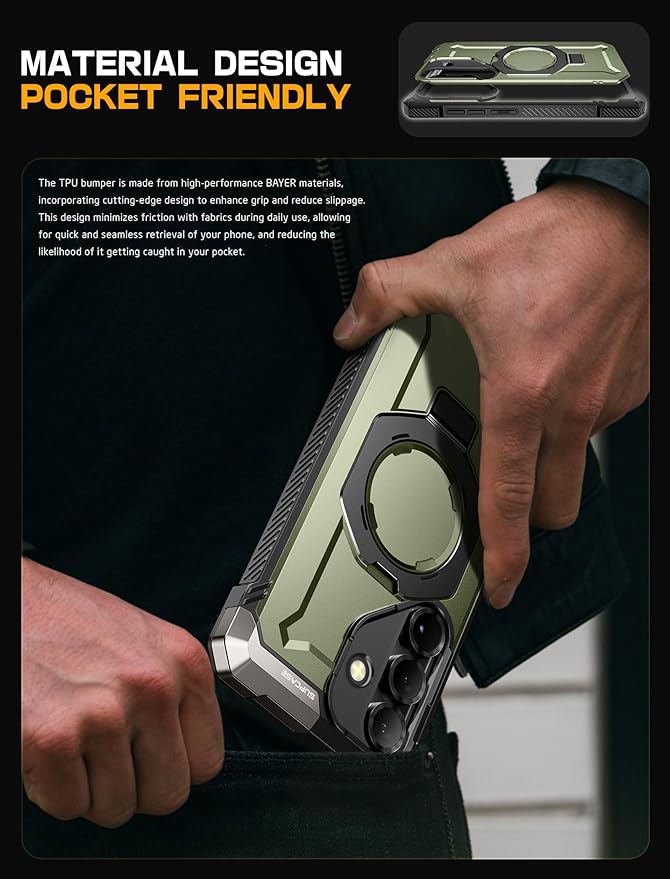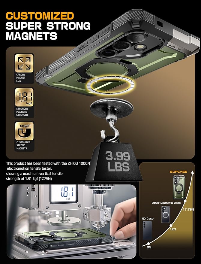 - Built-in aluminum alloy kickstand offers multiple viewing angles. Equipped with an N52 powerful magnet, delivering a magnetic force of up to 1500g ensuring seamless compatibility with MagSafe accessories (magnetic car mount, MagSafe wireless charger, magnetic card holder, desktop magnetic wireless charging stand).