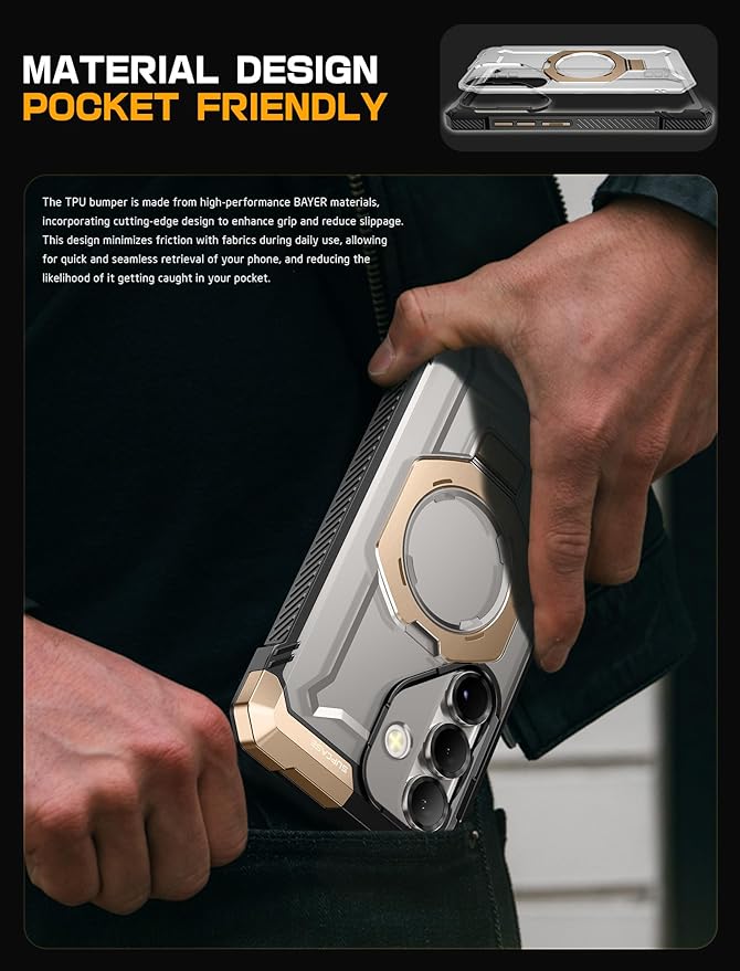 - Built-in aluminum alloy kickstand offers multiple viewing angles. Equipped with an N52 powerful magnet, delivering a magnetic force of up to 1500g ensuring seamless compatibility with MagSafe accessories (magnetic car mount, MagSafe wireless charger, magnetic card holder, desktop magnetic wireless charging stand).