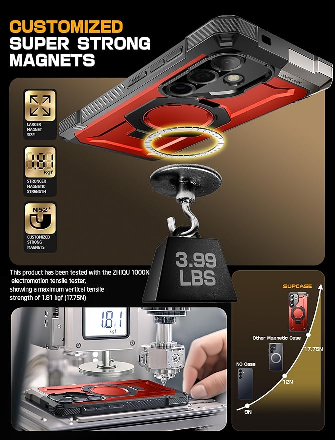 - Built-in aluminum alloy kickstand offers multiple viewing angles. Equipped with an N52 powerful magnet, delivering a magnetic force of up to 1500g ensuring seamless compatibility with MagSafe accessories (magnetic car mount, MagSafe wireless charger, magnetic card holder, desktop magnetic wireless charging stand).