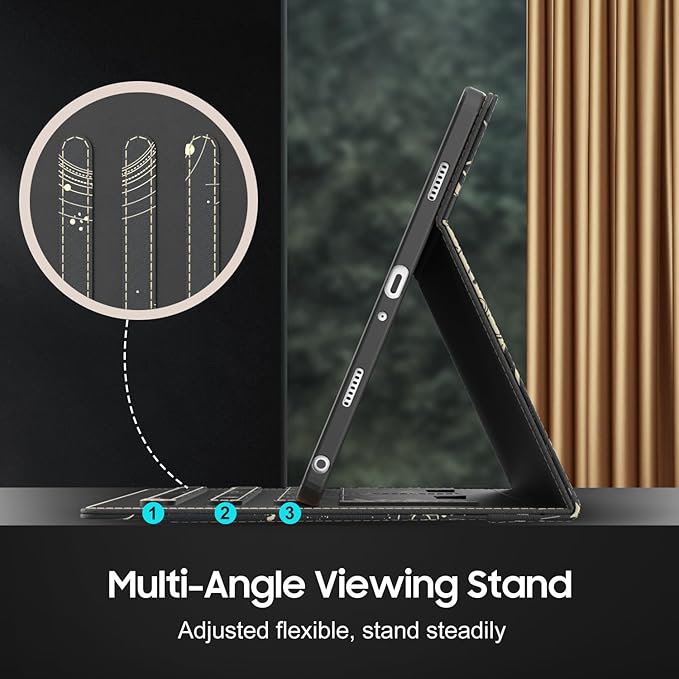 - Multiple Angles: 3 anti-slip strips keep case standing stably so you can type or watch easily. Adjust the viewing angle flexibly to meet your needs and free hands. Large pocket and two card slots are for bank cards, notes, cash,paper,documents etc