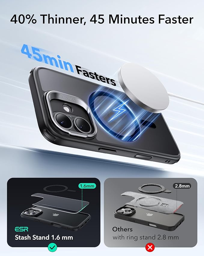 - Adjustable Stash Stand: positioned around camera frame to stay hidden when folded away while keeping MagSafe ring 100% unobstructed