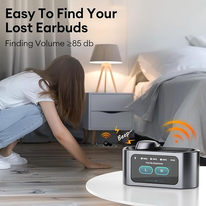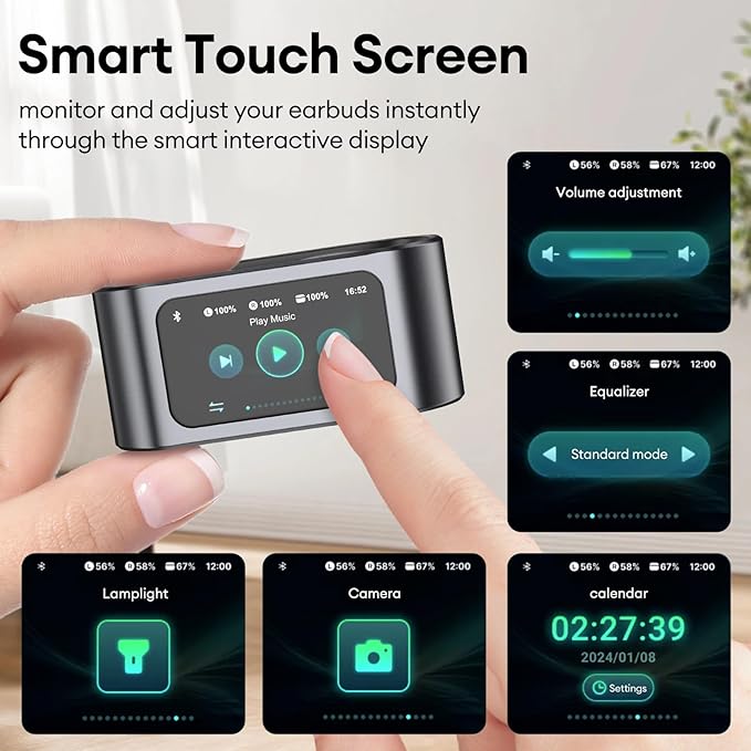 - Smart LED Touchscreen Charging Case: 1.47-inch display shows date, time, battery, and Bluetooth connectivity. Features include finding earbuds, photo capture, brightness and time adjustments, volume control, track skip, lyrics, timer, and games.Making it a versatile and practical blue tooth ear buds for everyday use