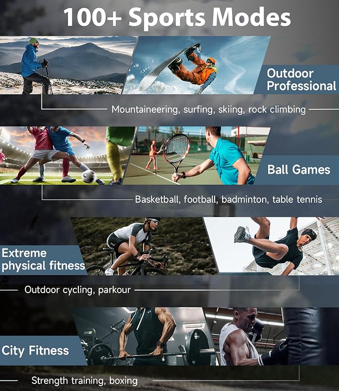 - đă100+ Sports Modes Fitness Watchă This step tracker watch is the perfect companion for fitness enthusiasts, featuring 100+ sports modes including walking, running, and cycling, accurately tracking your exercise data. You can clearly see your steps, distance, and calories burned, making every workout more effective. Whether it's indoor sports or outdoor sports, this sports watch meets your needs and motivates you to challenge yourself. The waterproof smart watch features upgraded sealing technology with an IP67 rating, meeting your daily needs. (Note: Not suitable for seawater or diving.)