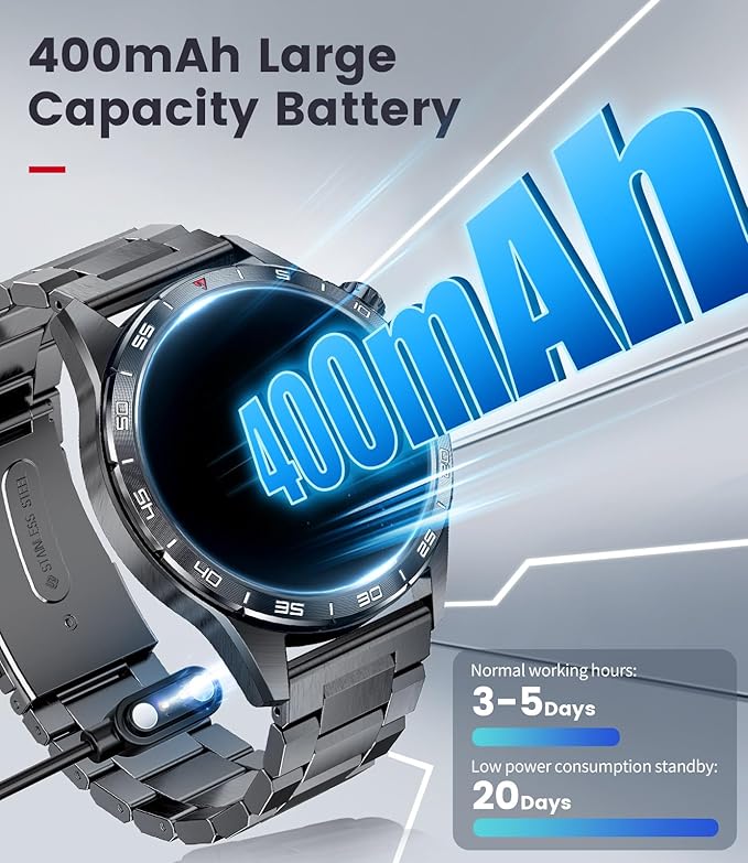 - 【400mAh Excellent Battery and Military-Grade Performance】: This military smart watch is equipped with a high-efficiency 400mAh lithium-ion battery to ensure excellent battery life. It can be used continuously for 7-10 days under normal operating conditions, and a single charge can achieve a maximum standby time of up to 20 days, meeting your needs for long-term wear without frequent charging. In addition, it adopts magnetic charging technology, which can be fully charged in just 2.5 hours. In addition, the rugged android smart watch has excellent scratch resistance, heat resistance, cold resistance and wear resistance, ensuring its durability even in the harshest conditions.