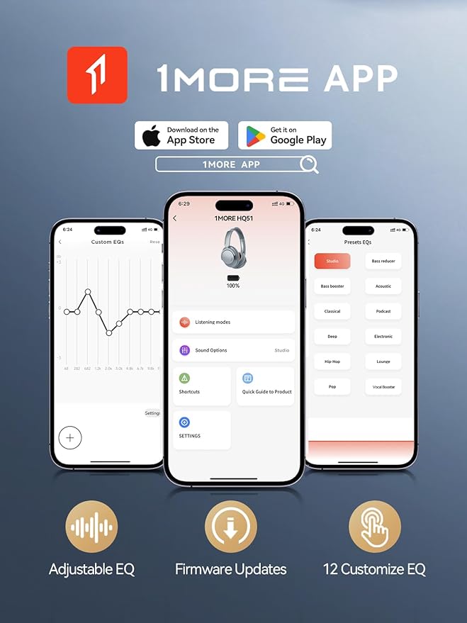 - Customizable EQ Headphones with App: Personalize your app-controlled headphones with 12 EQ modes in the 1MORE app, including Bass Boost headphones and Vocal Enhanced headphones settings.