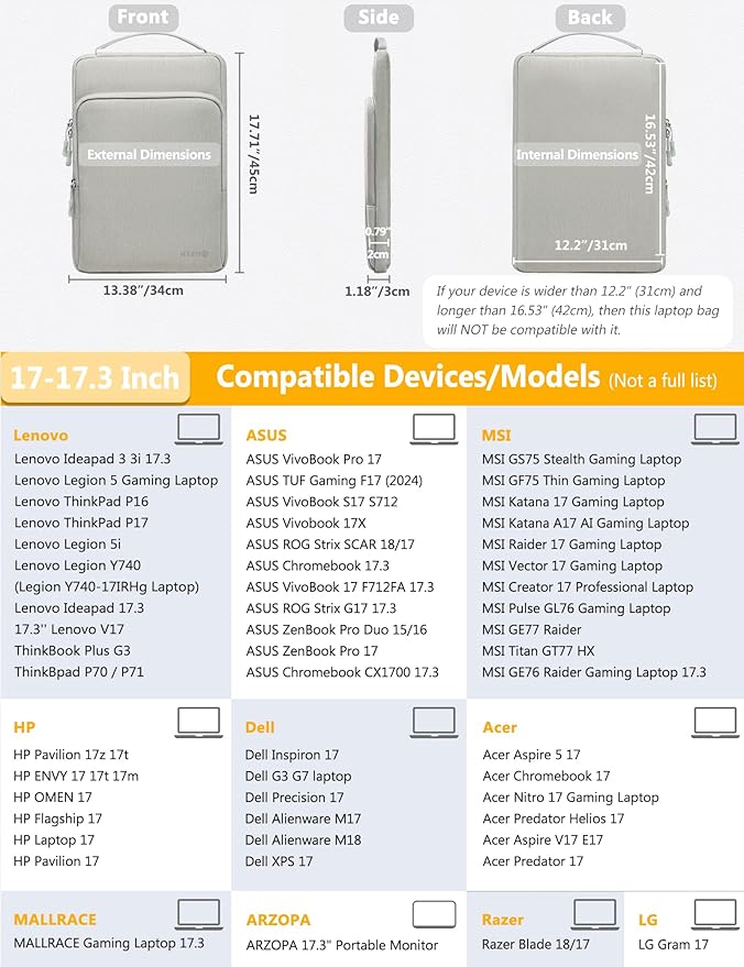 - Internal Dimensions: 16.53" x 11.81" x 0.79". Compatible with HP Laptop 17, HP Pavilion/ENVY/OMEN/Flagship 17, Dell Inspiron/Precision/XPS 17, ASUS VivoBook (Pro) 17, ASUS ChromeBook 17.3, ASUS ZenBook Pro 17, ASUS ROG Strix Scar 17, ASUS TUF Gaming F17, Lenovo Ideapad 3 3i 17.3, Lenovo ThinkPad P17, Lenovo Legion 17.3, Razer Blade 17/18, MSI Gaming Laptop 17, MALLRACE Gaming Laptop 17.3, LG Gram 17, etc.