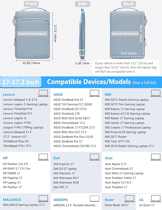 - Internal Dimensions: 16.53" x 11.81" x 0.79". Compatible with HP Laptop 17, HP Pavilion/ENVY/OMEN/Flagship 17, Dell Inspiron/Precision/XPS 17, ASUS VivoBook (Pro) 17, ASUS ChromeBook 17.3, ASUS ZenBook Pro 17, ASUS ROG Strix Scar 17, ASUS TUF Gaming F17, Lenovo Ideapad 3 3i 17.3, Lenovo ThinkPad P17, Lenovo Legion 17.3, Razer Blade 17/18, MSI Gaming Laptop 17, MALLRACE Gaming Laptop 17.3, LG Gram 17, etc.