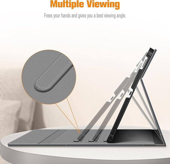 - Multiple Viewing Angles: Three anti-slip stripes allow you to adjust the tablet to multiple angles securely. Built-in magnetic strip provides sleep / wake feature