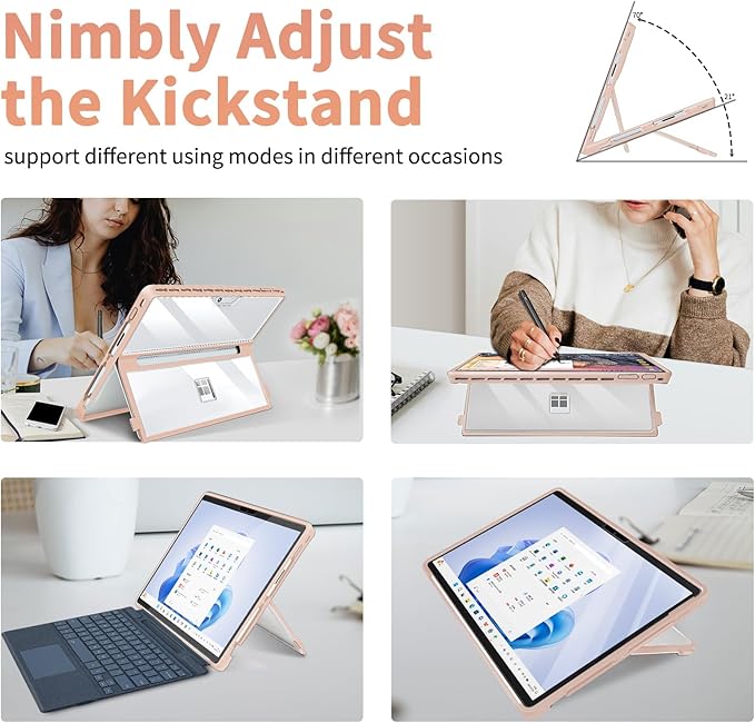 - 【Comfortable Experience】Featuring a channel for seamless connection to the Microsoft Surface Pro 11, Pro 10, Pro 9, Pro 8 type cover keyboard, this case allows users to easily use their device without having to remove the case. Adjusting to different angles is made easy with the built-in kickstand, allowing you to find the perfect viewing position without having to remove the case. The durable hard shell also safeguards the built-in kickstand from scratches, bumps, and stains.