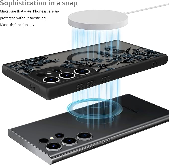 Fiyart Designed for Samsung Galaxy S24 Ultra Case Matte Flowers Design Compatible with MagSafe Wireless Charging,Cute Floral Anti-Scratch Translucent Phone Cover for Women Girls 6.8"-Black