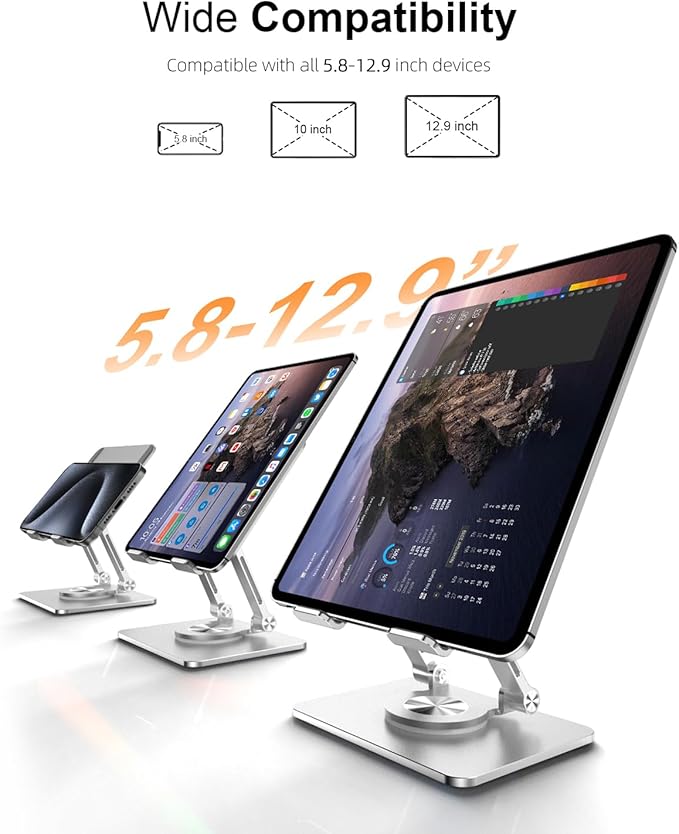 - Universal Compatibility, One Stand for All Devices: This adjustable tablet stand is suitable for any tablet, e-reader or smart Phone. Even with a protective case, it is compatible with iPad, Phone, Samsung, Fire tablet, Kindle, etc. It can be used on both tablet computers and mobile phones, e-books and other devices. One stand is compatible with multiple devices.