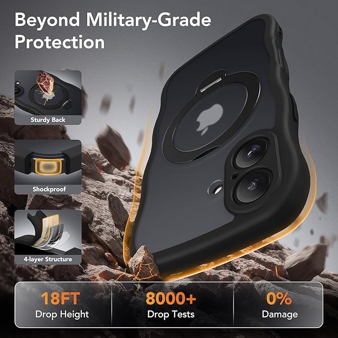 GolbinBox for iPhone 16 Plus Case,[Compatible with Magsafe][360° Spin Magnetic Stand][Military-Grade Protection][Camera Control][Cute Wave Edge] Translucent Matte Women Phone Cover for 16 Plus, Black