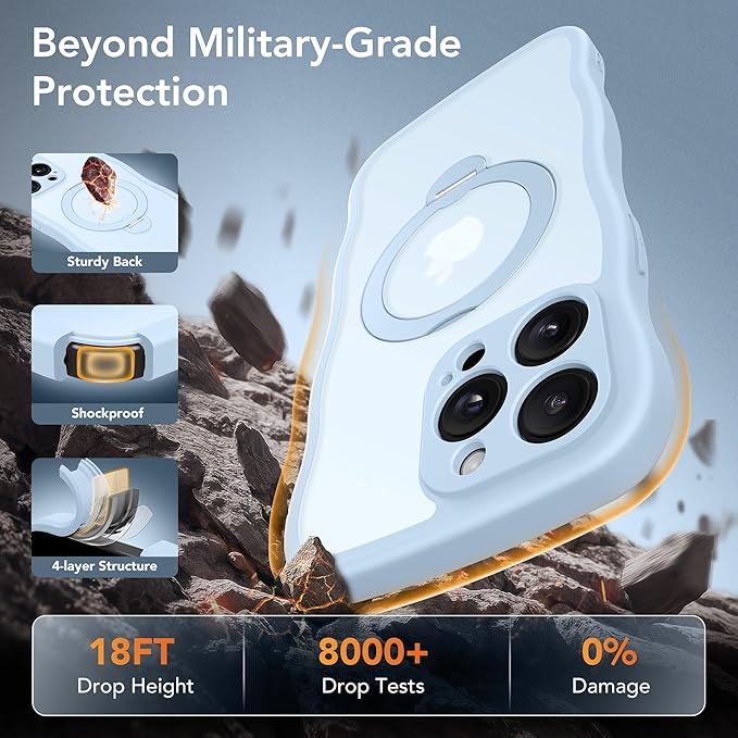 GolbinBox for iPhone 15 Pro Max Case,[Compatible with Magsafe][360°Magnetic Stand][Cute Wave Edge][18ft Military-Grade Protection] Translucent Matte Women Phone Cover for iPhone 15 Promax, Baby Blue