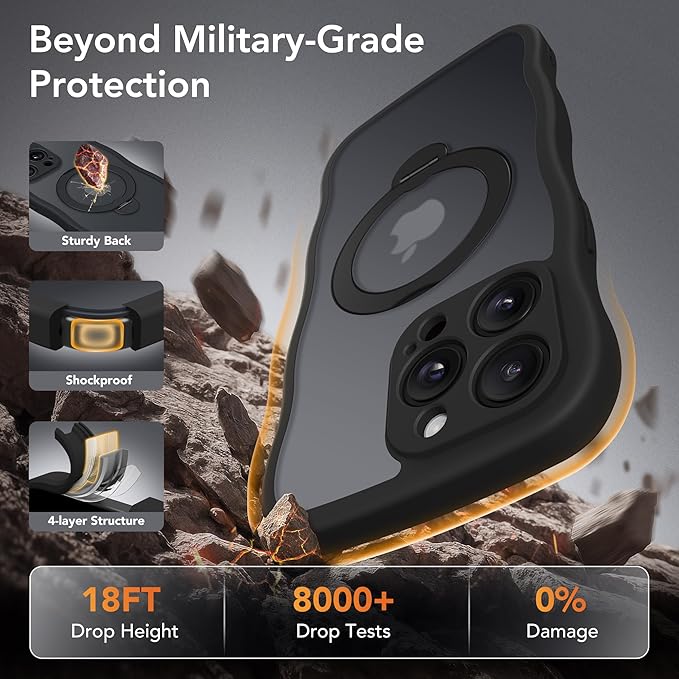 GolbinBox for iPhone 15 Pro Max Case,[Compatible with Magsafe][360°Magnetic Stand][Cute Wave Edge][18ft Military-Grade Protection] Translucent Matte Women Phone Cover for iPhone 15 Promax, Black
