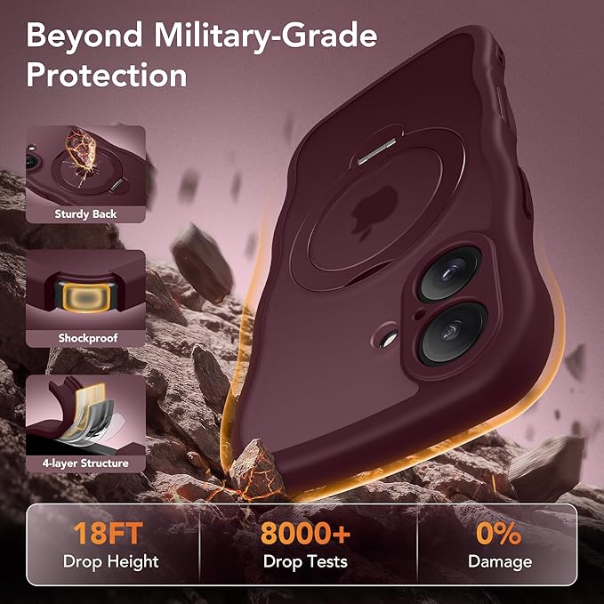 for iPhone 16 Plus Case,[Compatible with Magsafe][360° Spin Magnetic Stand][Military-Grade Protection][Camera Control][Cute Wave Edge]Translucent Matte Women Phone Cover for 16 Plus, Wine Red