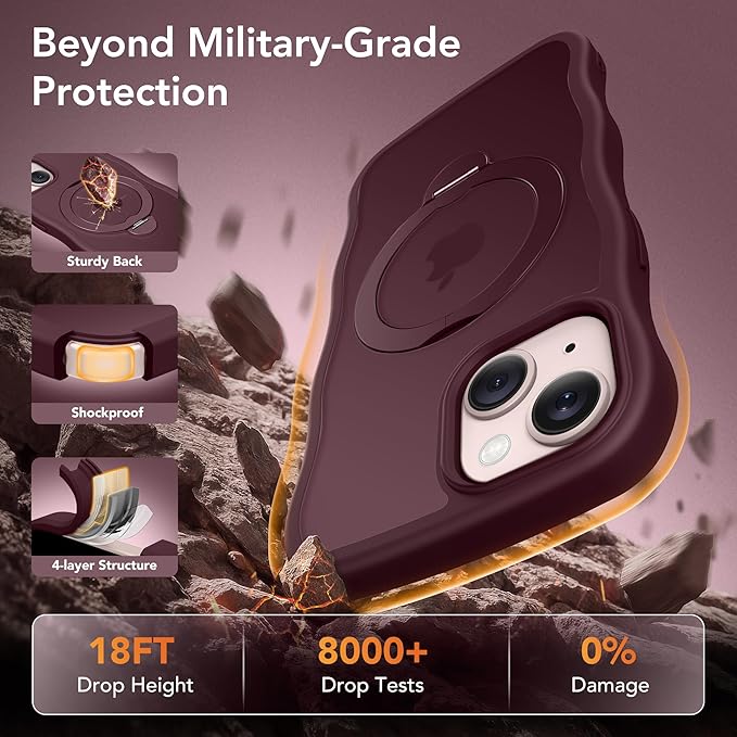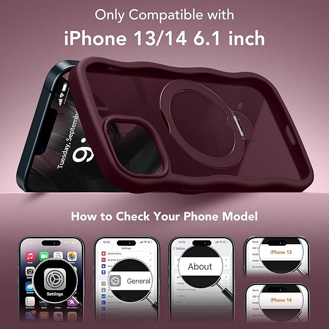for iPhone 13 Case & iPhone 14 Case for Women,[Compatible with Magsafe][360° Spin Magnetic Stand][Cute Wave Edge][Military-Grade Protection]Translucent Matte Phone case for iPhone 13/14, Wine Red