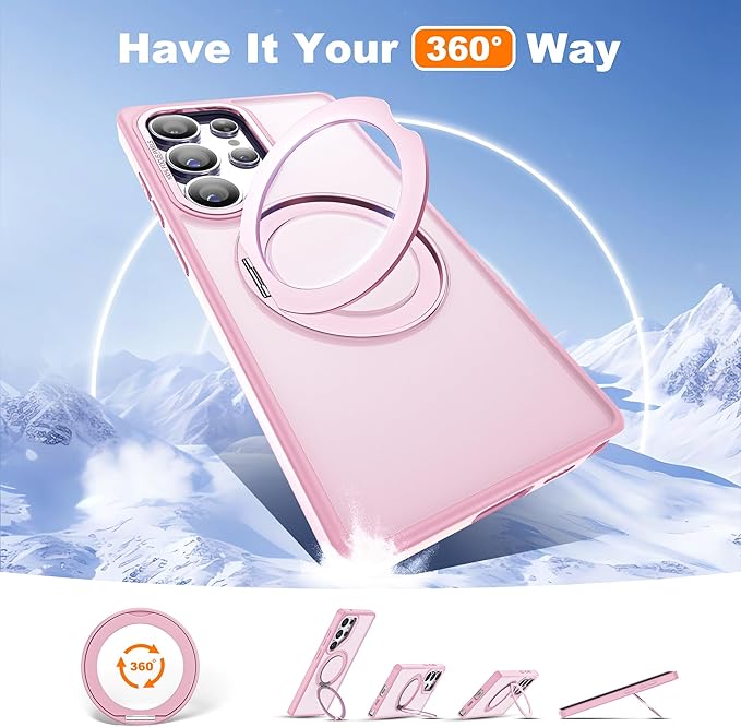 for Samsung Galaxy S25 Ultra Case with 360°Rotatable Magnetic Ring Stand Compatible with Mag-Safe Military Protection Shockproof Matte Translucent Phone Cases for S25 Ultra 6.9",Pink