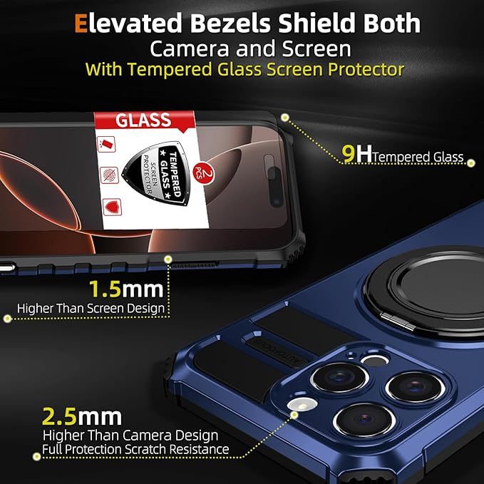 for iPhone 16 Pro Max Case Magnetic Compatible with MagSafe,with 2 Screen Protector,Built-in Camera Cover+Kickstand Ring,Military Grade Drop Shockproof Heavy Duty Protection Phone Bumper Blue