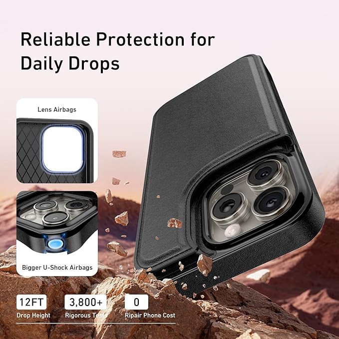 - Military-Grade MIL-STD-810G Protection - Crafted with premium leather and reinforced shock-absorbent corners, this iPhone 14 Pro case offers military-grade MIL-STD-810G protection against drops of up to 1.2 meters, making it ideal for daily adventures or accidental slips. Additionally, it features a 5,000+ cycle magnetic clasp for instant, secure closure and 45° to 90° adjustable kickstand for binge-watching, video calls, or reading—all designed for convenient one-hand operation.