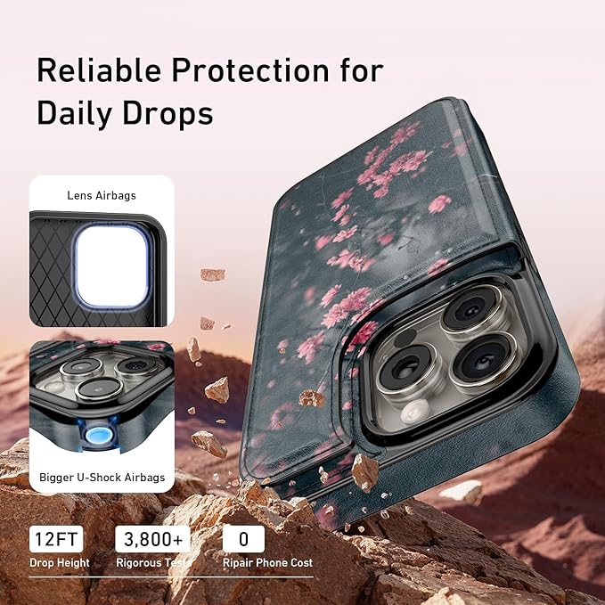 - Military-Grade MIL-STD-810G Protection - Crafted with premium leather and reinforced shock-absorbent corners, this iPhone 15 Pro Max case offers military-grade MIL-STD-810G protection against drops of up to 1.2 meters, making it ideal for daily adventures or accidental slips. Additionally, it features a 5,000+ cycle magnetic clasp for instant, secure closure and 45° to 90° adjustable kickstand for binge-watching, video calls, or reading—all designed for convenient one-hand operation.