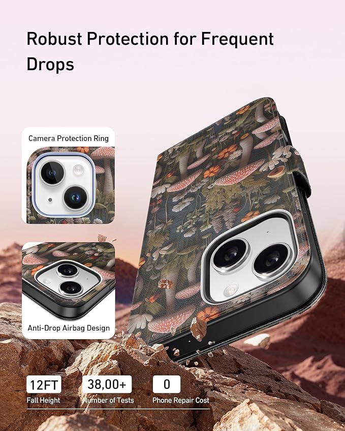 DEENAKIN for iPhone 15 Plus Wallet Case with Card Holder + Cash Clip, RFID-Blocking, Military-Grade Drop Protection, Magnetic Closure with Leather Kickstand - Mushroom Floral