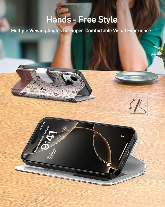 DEENAKIN for iPhone 15 Plus Wallet Case with Card Holder + Cash Clip, RFID-Blocking, Military-Grade Drop Protection, Magnetic Closure with Leather Kickstand - Vibrant Foliage