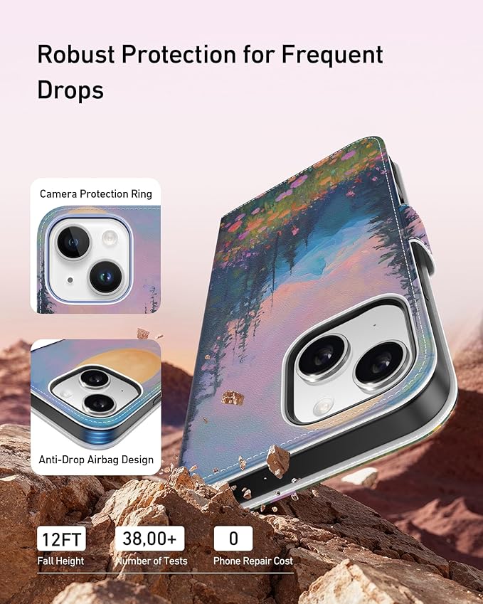 DEENAKIN for iPhone 15 Plus Wallet Case with Card Holder + Cash Clip, RFID-Blocking, Military-Grade Drop Protection, Magnetic Closure with Leather Kickstand - Mountain Blossom Glow