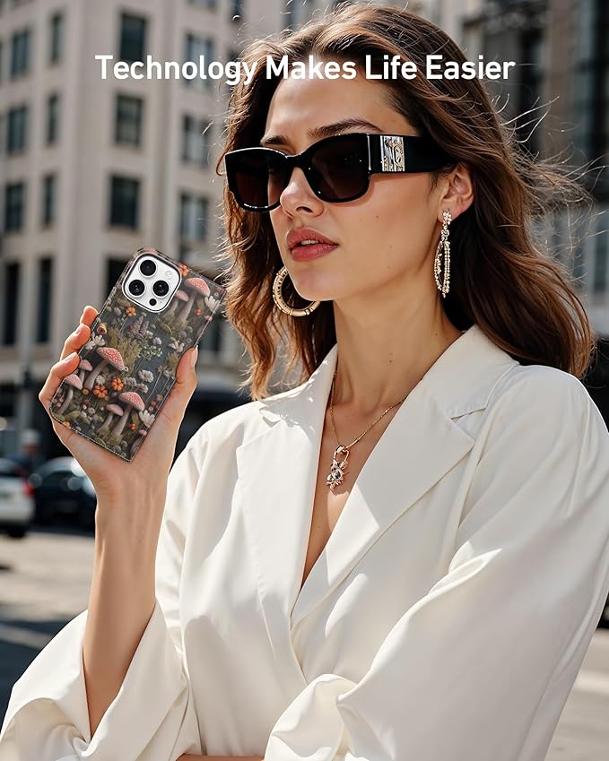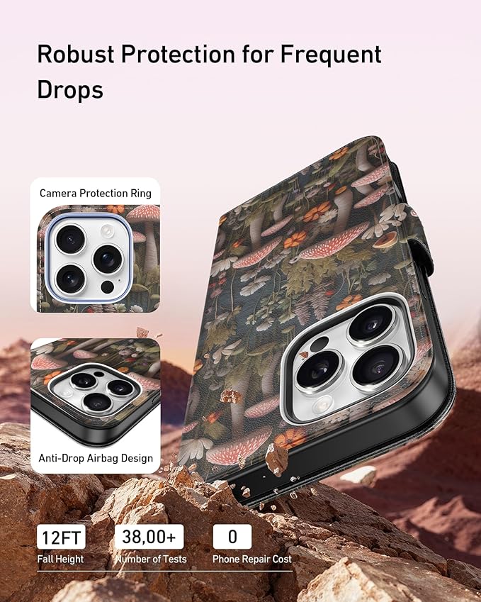 DEENAKIN for iPhone 15 Pro Max Wallet Case with Card Holder + Cash Clip, RFID-Blocking, Military-Grade Drop Protection, Magnetic Closure with Leather Kickstand - Mushroom Floral