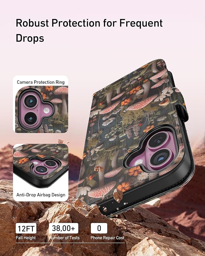 DEENAKIN for iPhone 16 Wallet Case with Card Holder + Cash Clip, RFID-Blocking, Military-Grade Drop Protection, Magnetic Closure with Leather Kickstand - Mushroom Floral