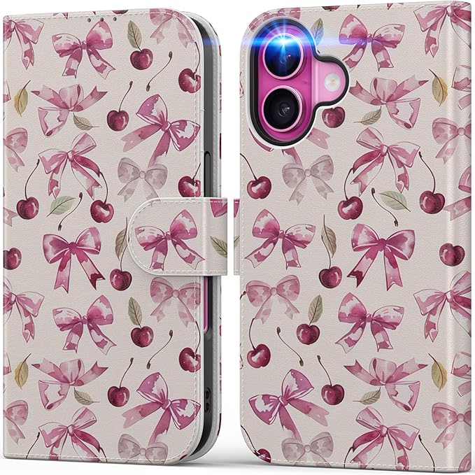 DEENAKIN for iPhone 16 Plus Wallet Case with Card Holder + Cash Clip, RFID-Blocking, Military-Grade Drop Protection, Magnetic Closure with Leather Kickstand - Cherry & Bowknot