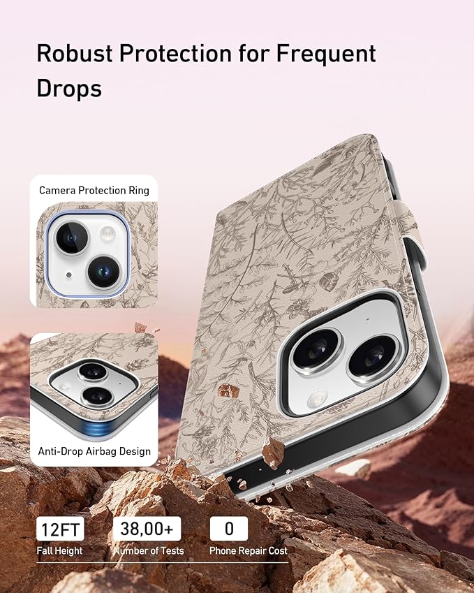 DEENAKIN for iPhone 15 Plus Wallet Case with Card Holder + Cash Clip, RFID-Blocking, Military-Grade Drop Protection, Magnetic Closure with Leather Kickstand - Serene Foliage