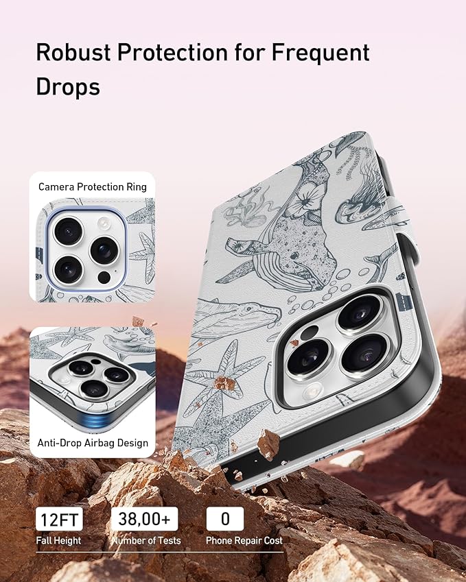 DEENAKIN for iPhone 16 Pro Wallet Case with Card Holder + Cash Clip, RFID-Blocking, Military-Grade Drop Protection, Magnetic Closure with Leather Kickstand - Dynamic Marine Life