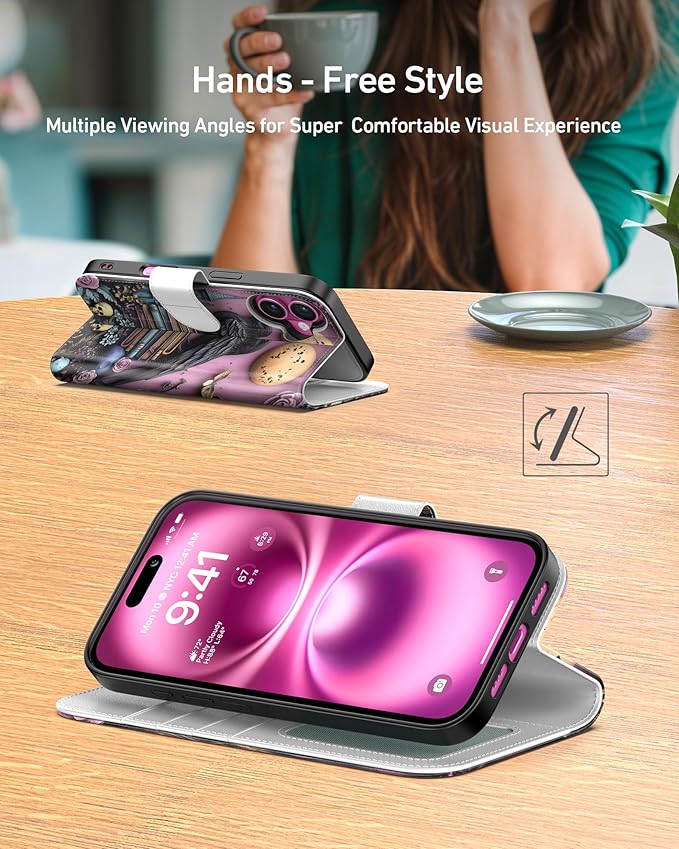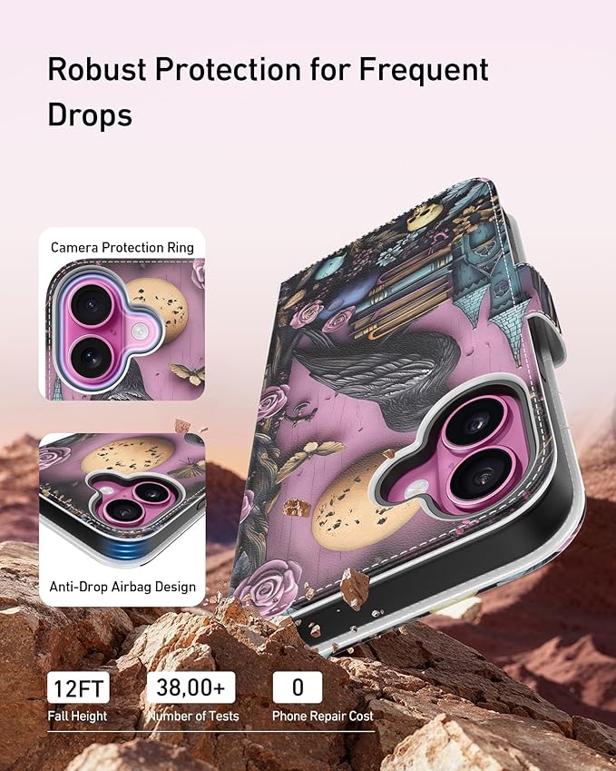 DEENAKIN for iPhone 16 Plus Wallet Case with Card Holder + Cash Clip, RFID-Blocking, Military-Grade Drop Protection, Magnetic Closure with Leather Kickstand - Gothic Skull & Raven