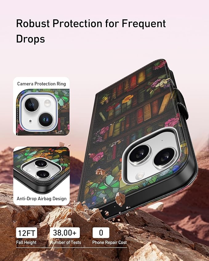 DEENAKIN for iPhone 15 Plus Wallet Case with Card Holder + Cash Clip, RFID-Blocking, Military-Grade Drop Protection, Magnetic Closure with Leather Kickstand - Bookshelf Flowers