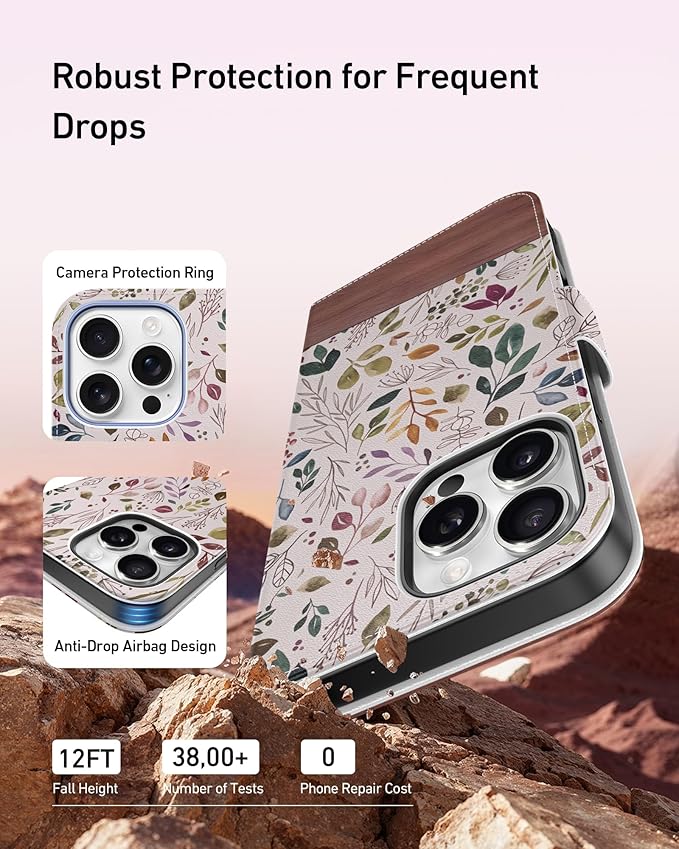 DEENAKIN for iPhone 16 Pro Wallet Case with Card Holder + Cash Clip, RFID-Blocking, Military-Grade Drop Protection, Magnetic Closure with Leather Kickstand - Vibrant Foliage