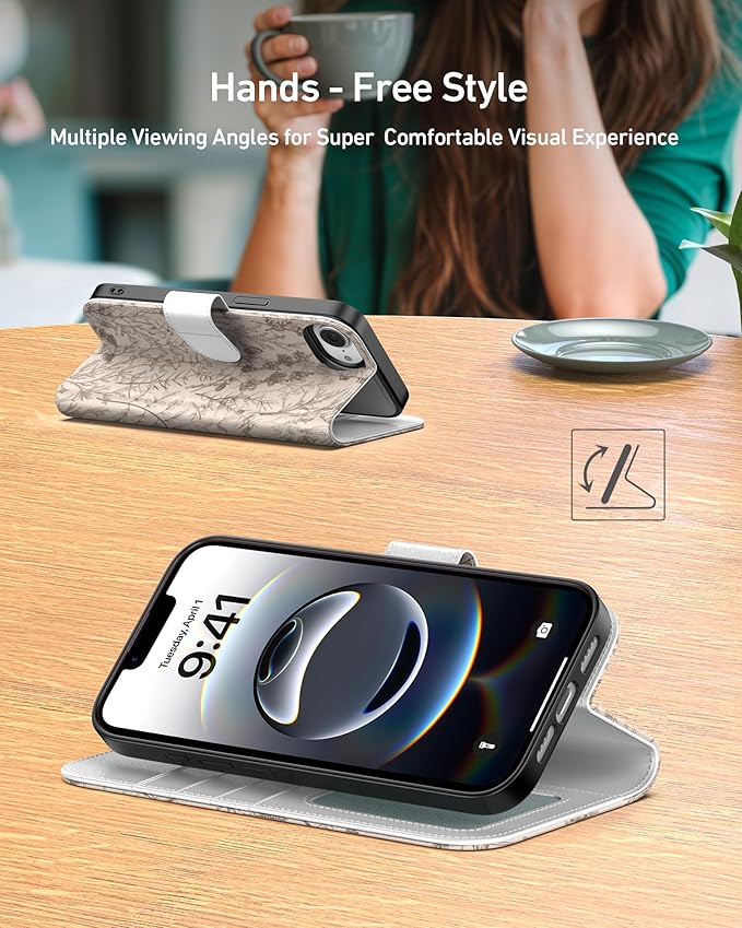 DEENAKIN for iPhone 16e Wallet Case with Card Holder + Cash Clip, RFID-Blocking, Military-Grade Drop Protection, Magnetic Closure with Leather Kickstand - Serene Foliage