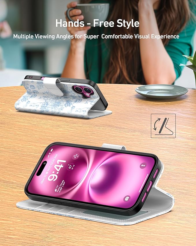 DEENAKIN for iPhone 16 Plus Wallet Case with Card Holder + Cash Clip, RFID-Blocking, Military-Grade Drop Protection, Magnetic Closure with Leather Kickstand - Blue Floral Design