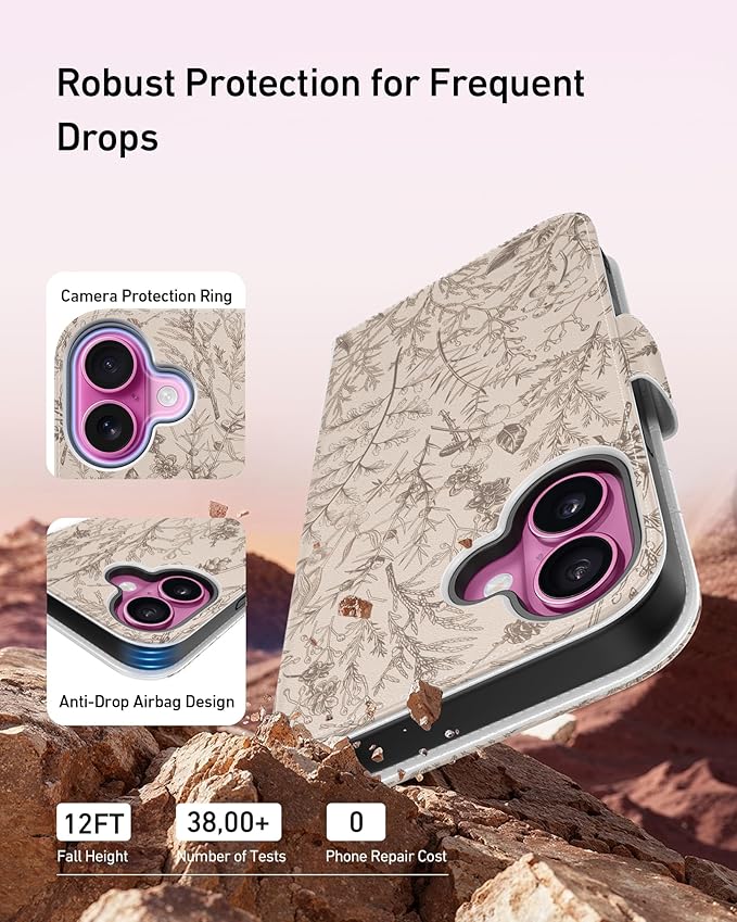 DEENAKIN for iPhone 16 Plus Wallet Case with Card Holder + Cash Clip, RFID-Blocking, Military-Grade Drop Protection, Magnetic Closure with Leather Kickstand - Serene Foliage