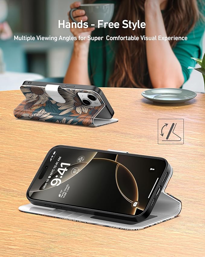 DEENAKIN for iPhone 15 Plus Wallet Case with Card Holder + Cash Clip, RFID-Blocking, Military-Grade Drop Protection, Magnetic Closure with Leather Kickstand - Floral Daisy Pattern