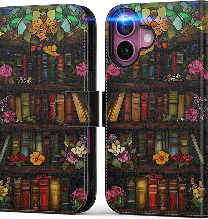 DEENAKIN for iPhone 16 Wallet Case with Card Holder + Cash Clip, RFID-Blocking, Military-Grade Drop Protection, Magnetic Closure with Leather Kickstand - Bookshelf Flowers